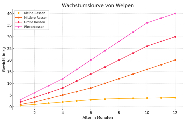 Durch das Verbinden der Messpunkte entsteht eine anschauliche Kurve, die die Wachstumsphasen deines Welpen illustriert. Indem du diese Kurve mit typischen Wachstumskurven für die jeweilige Rasse vergleichst, kannst du sicherstellen, dass sich dein Welpe gesund entwickelt. Die Kurve hilft dir, Phasen schnellen Wachstums sowie langsamere Wachstumsphasen zu erkennen, was dir wertvolle Hinweise auf den Nährstoffbedarf deines Welpen gibt.